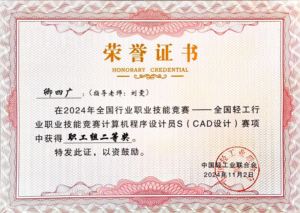 11月2日,2024年全国行业职业技能竞赛——轻工行业职业技能竞赛计算机程序设计员S(CAD设计)赛项决赛在台州技师学院闭幕,我校教师卿四广在职工组比赛中获得全国二等奖的佳绩。