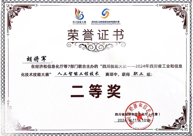 近日,由四川省经济和信息化厅、教育厅、人力资源和社会保障厅等7部门联合举办的“四川技能大赛—2024年四川省工业和信息化技术技能大赛(人工智能工程技术赛项)”,在四川省广元市成功举行。经过两天的激烈比拼,我校计算机学院胡将军老师在全省近30支队伍中脱颖而出,取得全省第三名的好成绩,最终荣获二等奖!