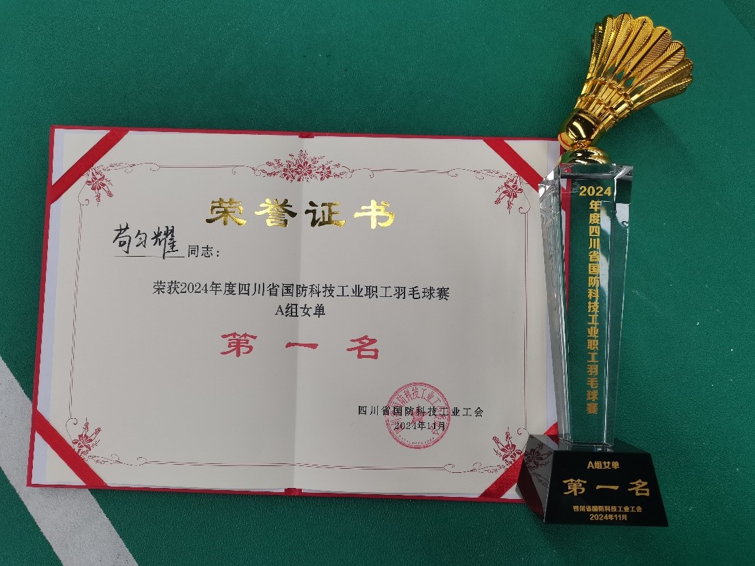 2024年11月24日至26日,备受瞩目的2024年度四川省国防科技工业职工羽毛球比赛在双流李宁启成运动中心顺利举行。此次比赛汇集了来自全省国防科技工业领域的众多高手,竞争异常激烈。我校苟匀耀老师作为四川航天代表队的一员,以出色的球技和顽强的拼搏精神,成功获得了A组女单的第一名,为四川航天代表队争得了荣誉。