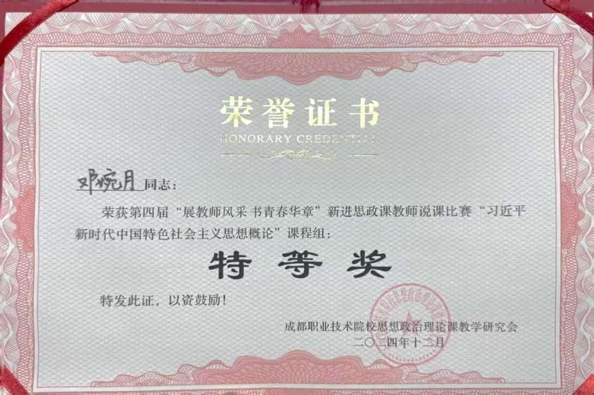 2024年12月19日至21日,成都职业技术院校思想政治理论课教学研究会2024年年会暨第四届“展教师风采 书青春华章”新进思政课教师说课比赛在成都纺织高等专科学校召开。根据前期线上评审结果,我校马克思主义学院教师邓婉月进入决赛参加“习近平新时代中国特色社会主义思想概论”组说课比赛现场赛。
