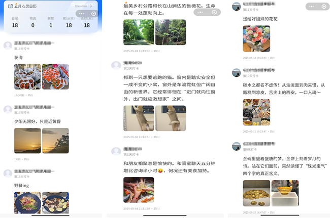 这场持续 15 天的心灵之旅,陪伴师生在五月度过了温馨而充实的时光。参与者的打卡内容丰富多彩:有人分享了与朋友相聚的欢乐时光,那些温暖的聊天与美食,让人心生向往;有人记录了野餐的美好瞬间,与大自然亲密接触,感受生活的惬意;还有人定格了夕阳下的美景,那无尽的余晖与黄昏的宁静,触动了无数心灵。这些记录不仅展现了生活的美好,更让大家在分享与交流中,收获了心灵的慰藉与成长。