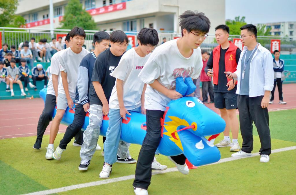 随着发令哨响,色彩鲜艳的充气龙舟如离弦之箭,在绿茵场上“劈波斩浪”。各队队员跨坐龙舟,紧握把手,在整齐响亮的“左!右!”口号指挥下,大家步调一致驱动龙舟疾驰。男子组气势如虹,尽显力量与拼搏;女子组默契配合,柔韧中见速度;混合组男女协作,完美诠释“同心协力”;教师组登场引爆高潮,老师们奋力前进的认真模样赢得满场喝彩与欢笑,师生同乐氛围格外温馨。