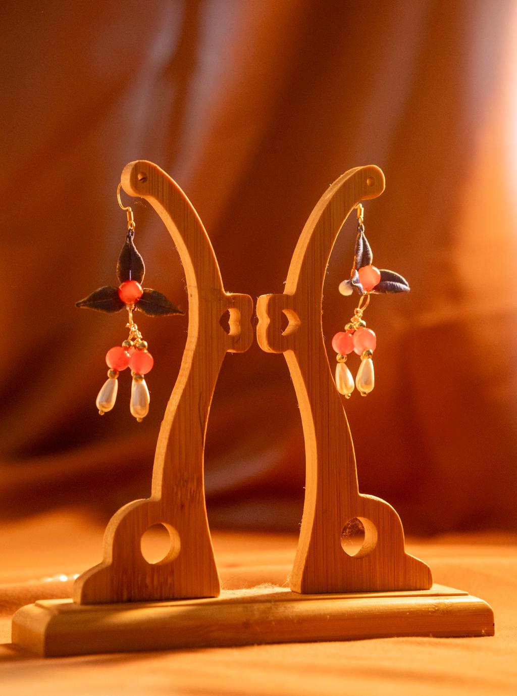 凌欣妧、吴蓉蓉、王滟、李家雪团队以明代凤冠为创作根基,运用非遗缠花工艺打造作品《凤仪靖华》。明代凤冠以金丝翠羽铸就皇家威仪,团队则以多色丝线在坯架上精心缠绕,复刻凤冠的华美轮廓与层次细节,将传统礼冠的庄重意蕴与缠花工艺的轻盈灵动完美融合,成为传统工艺当代转化的生动实践。