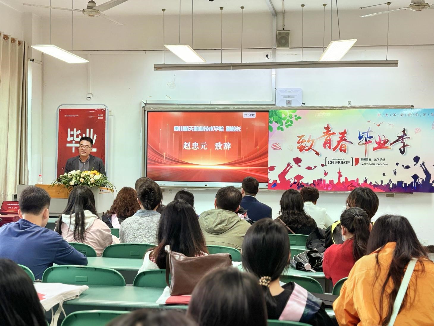 典礼在庄严的国歌声中拉开帷幕。赵忠元副校长代表学校向获取四川大学高等教育自学考试本科毕业生表示祝贺,并发表了热情洋溢的致辞。赵校长指出,高等教育自学考试是畅通人才成长通道、服务全民终身学习的重要途径。学校始终将自考专升本工作摆在人才培养的突出位置,坚持以生为本、助人成才,系统构建了覆盖全过程、融入全方位、贯通全链条的自考助学体系。同时,赵校长高度肯定了专本套读学习中心的助学工作,并从顶层设计、资源整合、多元育人、成果导向四个方面回顾了学校在自考专升本工作中的系统化举措。最后,赵校长寄语全体毕业生,要胸怀家国、笃行致远、心怀感恩,将自考路上锤炼的自律与坚韧转化为终身发展的底气,在各自岗位上书写航天人不平凡的责任担当。