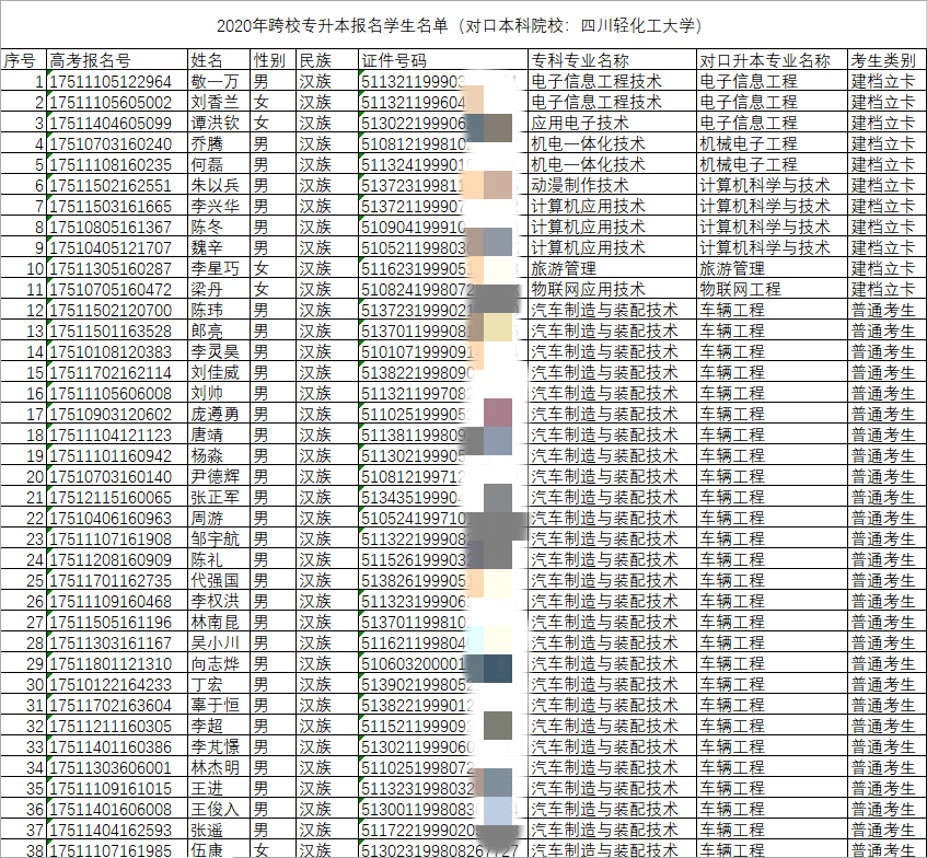 2020年跨校专升本报名学生名单(对口本科院校:四川轻化工大学)