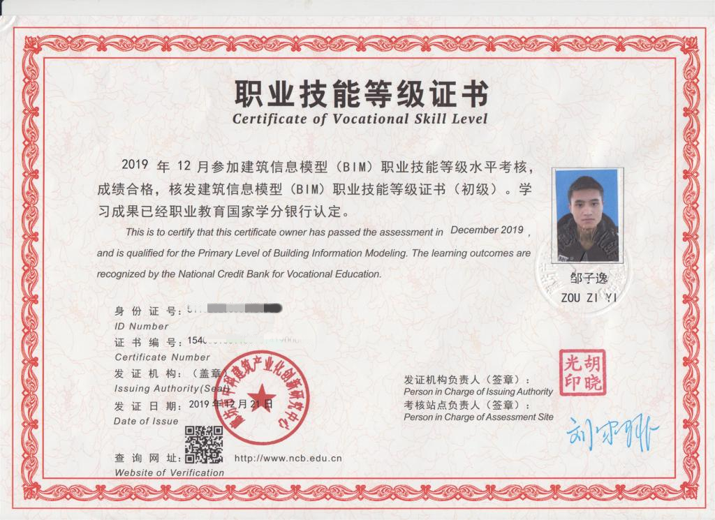 近日,于2019年12月21日由教育部组织的“1+X”BIM职业技能等级证书考试中,学院学子邹子逸荣获“1+X”建筑信息模型(BIM)职业技能等级证书。