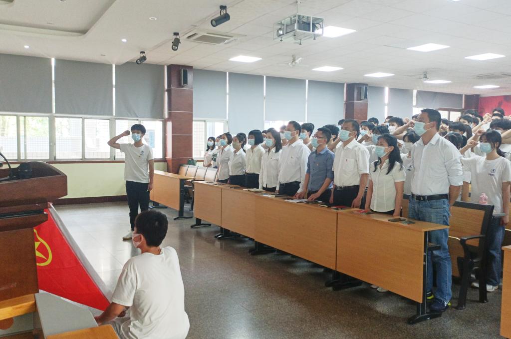 近日,基础教学团总支在龙泉校区南阶梯教室隆重举行了2022年新团员入团仪式。学院院长助理、基础教学部主任王立波,学院团委副书记何华权,基础教学部副主任赖秦超,副书记陈水松出席会议,系部全体辅导员及70名新团员、部分团学干部参加了会议。