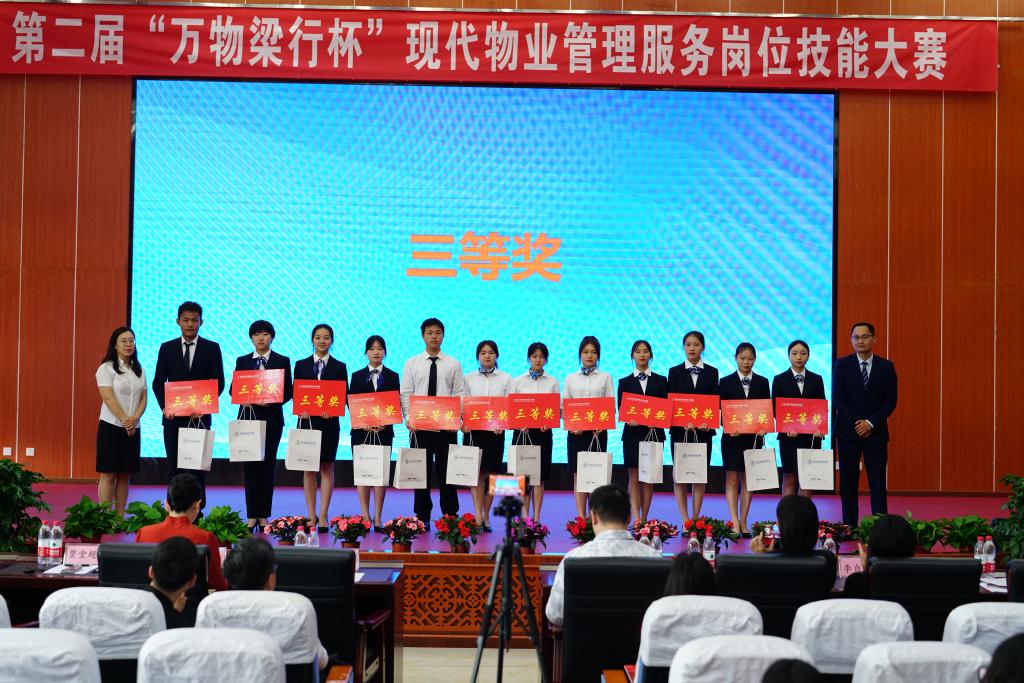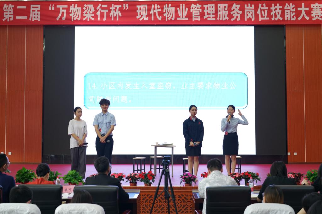 为进一步提高学院现代物业管理专业学生职业技能,积极拓展学生就业渠道,本着“以赛促教,以赛促学”的理念,在管理工程系及万物梁行物业公司的共同努力下,5月25日,由管理工程系主办、人文社科系协办的“万物梁行杯”物业服务岗位技能大赛,在三星堆校区学术报告厅顺利进行并圆满落幕。万物梁行成都区域招聘经理扈成刚、人才发展经理何玉儒、客户专家袁可、案场服务部经理贾堂超、品牌经理李剑鹏,成都龙湖物业服务有限公司人事经理李自净,保利物业成都分公司项目经理舍芹、四川省房协常务理事聂智华等企业代表,学院管理工程系主任李建群、副主任张欢、物业教研室主任倪霓和人文社科系空中乘务教研室主任岳亮出席了此次比赛。