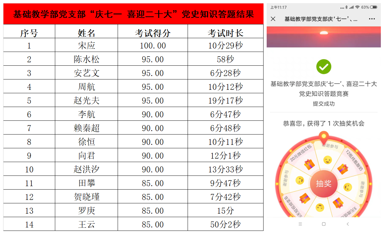 2022年是中国共产党成立101周年,为大力弘扬建党精神,讴歌党的丰功伟绩,加强对百年党史的学习,增强党员同志党性修养,教育党员教师不忘初心、牢记使命,勤奋学习,努力工作,以优异的成绩迎接党的二十大的胜利召开,7月1日上午,基础教学部党支部开展了“庆七一 喜迎二十大”党史知识线上答题活动,支部全体党员参与了此次活动。