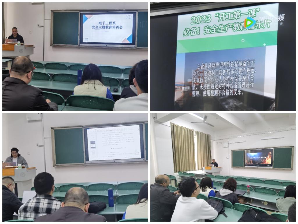 为加强平安校园建设,进一步提高师生的安全意识和自防自救能力,全面落实《学院安全生产委员会2023年第一次会议》精神,3月8日和12日,电子工程系在三星堆校区分别组织全系教职工和30个班级召开了安全工作专题培训学习会与《校园火灾案例警示片》安全主题教育学习。会后全体教职工签订了《2023年全员安全岗位责任书》和《2023年全员安全风险告知书暨遵章守纪承诺书》。