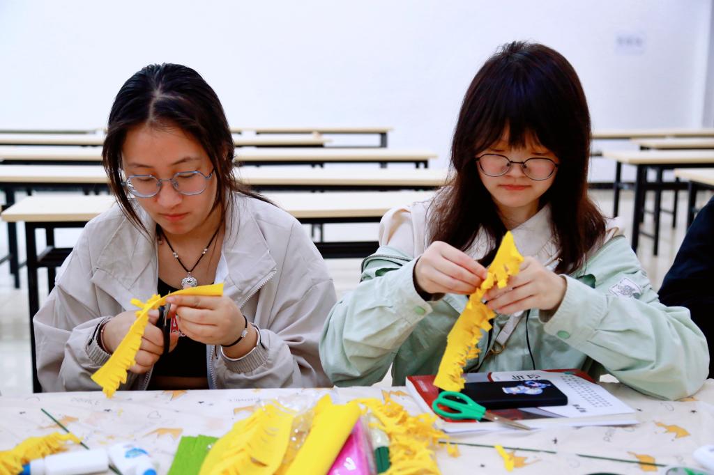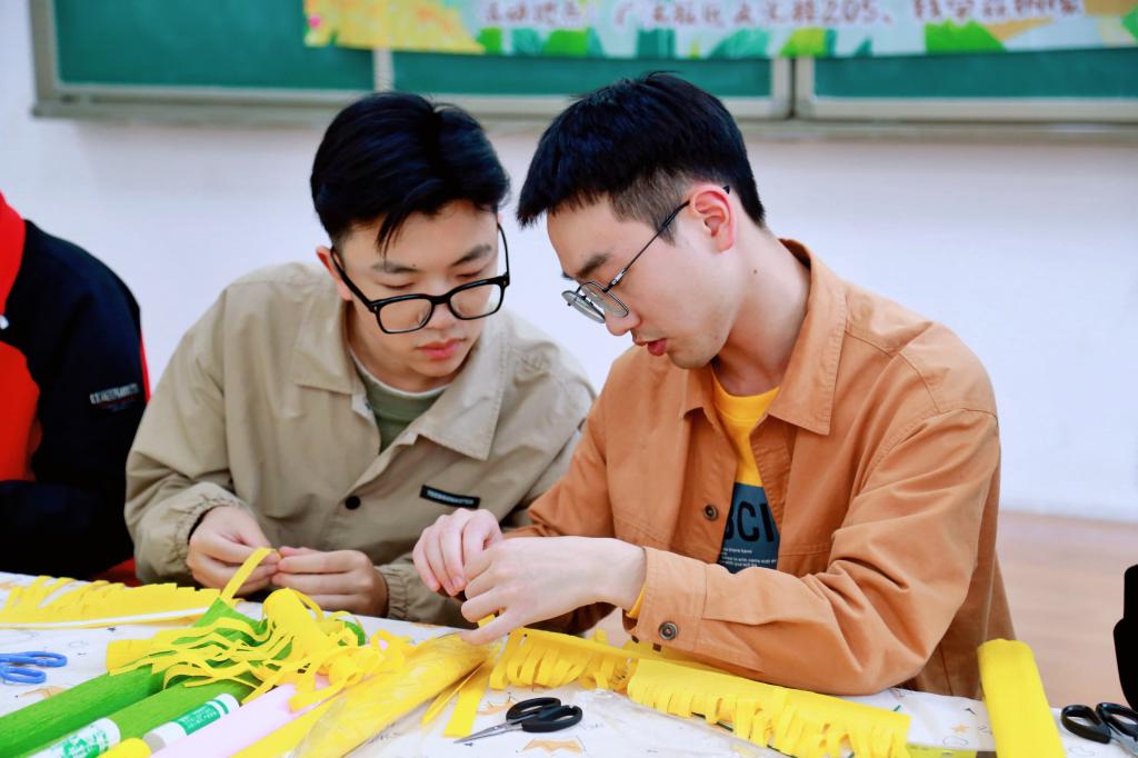 万物生长此时,皆清洁而明净,故谓之清明。清明节承载着中华民族独特的精神和情感。在活动开始前,张皓南老师首先为同学们讲解了清明节的传统习俗和钱学森的光辉事迹。随后,同学们于长桌前围成一圈,在老师的带领下学习制作皱纹纸菊花。