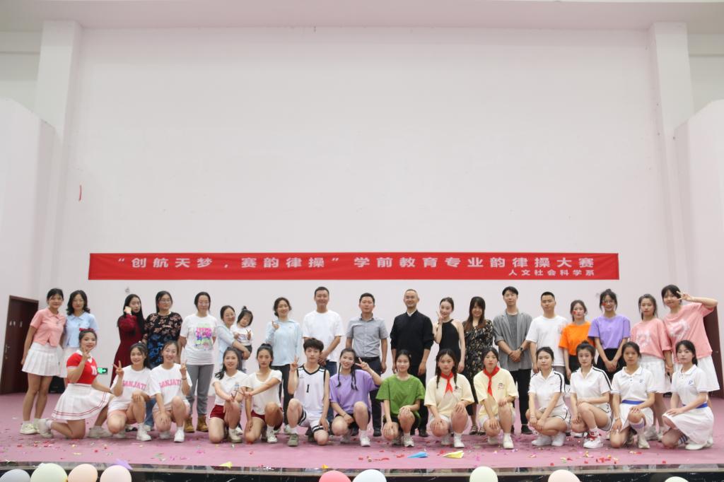 为弘扬“五四”精神,凝聚新时代青年力量,展示青春风采,展现专业特色,近日,人文社会科学系广汉校区体育馆内举办了2023年度学前教育专业“创航天梦·赛韵律操”比赛,人文社会科学系2022级学前教育专业10个班级参与了此次活动。