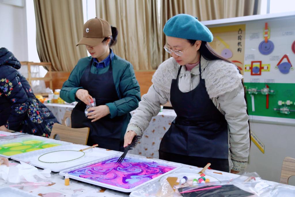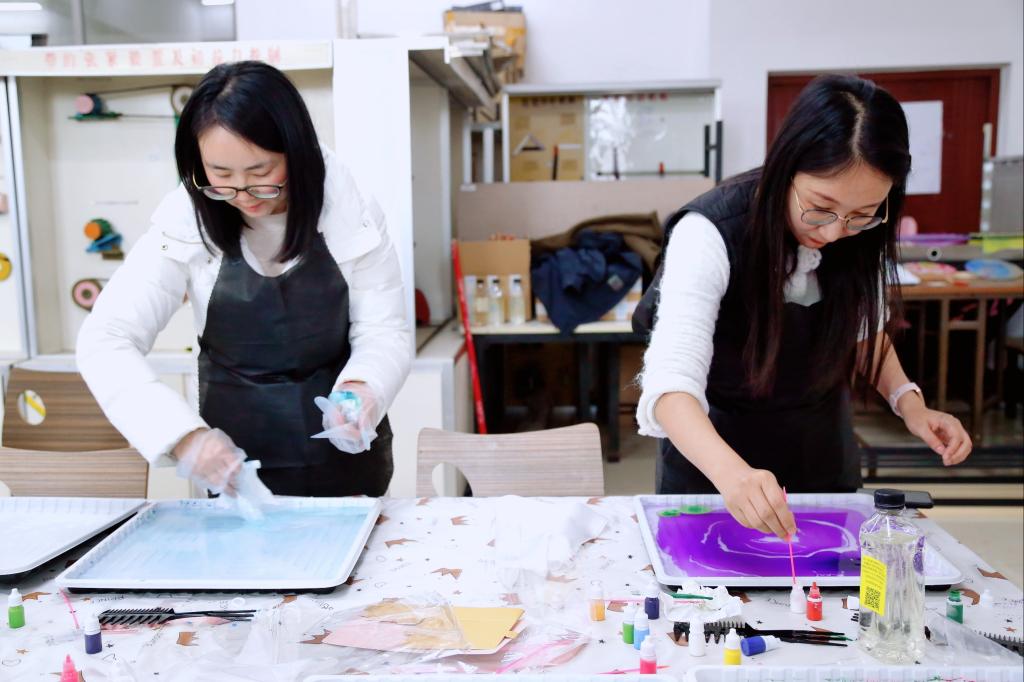 女教职通过向水里滴撒各种颜料,使颜料在水中自然交融、变化,形成奇妙绚丽的色彩纹理,再对颜料上轻轻拨动勾勒形成风格各异的画作,利用丝巾和团扇的吸附性,把水面上的图案清晰拓印到丝巾和团扇上。从构图到色彩搭配,再到拓印,每个步骤都充满了中国传统文化的韵味,现场气氛温馨而又热烈。