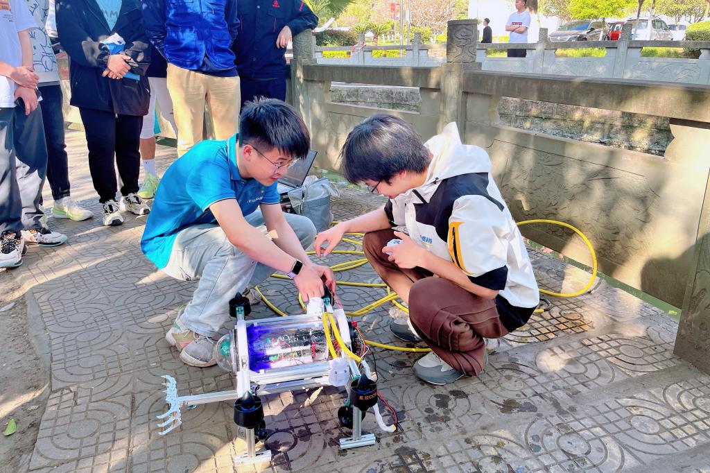 展览的亮点之一是千载科技工作室学生们自主制造的水下机器人,同学们将水下机器人带到了三星堆校区小月湖中进行实地测试。机器人的下水工作场景不仅是一次技术展示,更是对其功能的一次严格考验。