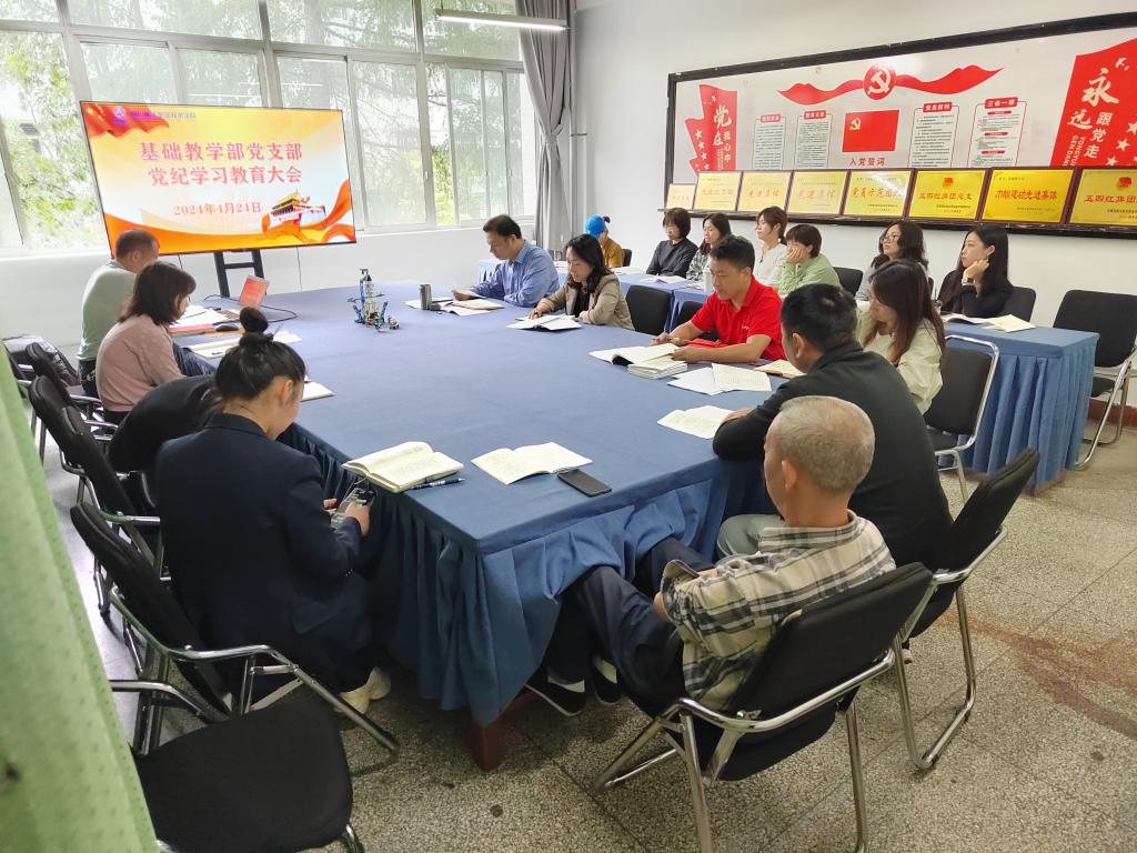 按照学校党委关于开展党纪学习教育的总体部署,努力推动党纪学习教育走深走实,教育部门全体党员干部、职工学纪、知纪、明纪、守纪,始终做到忠诚干净担当,近日,基础教学部党支部召开党纪学习教育推进会。会议由支部书记王立波主持。