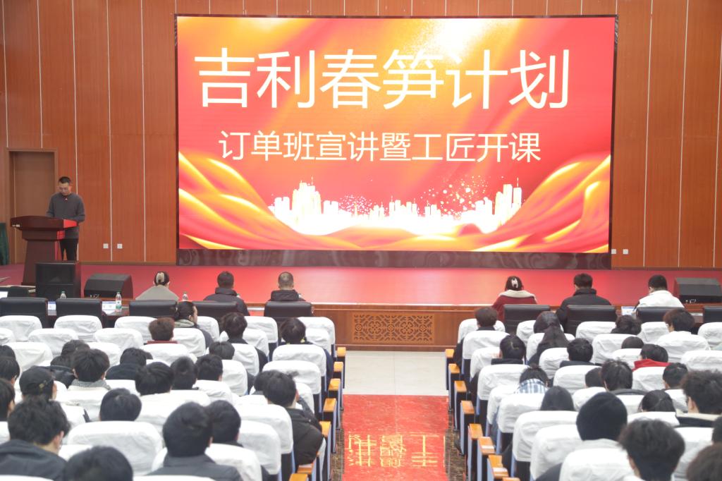 2024年12月31日上午,学校就业处携车辆工程学院与吉利汽车集团联合举办了“吉利春笋计划”订单班宣讲暨工匠开课仪式。本次活动致力于深化校企合作,探索产教融合新模式,为行业培养高质量工程技术与管理人才。吉利汽车集团动力制造公司春晓变速器厂经理孙银爱、就业处副处长唐小强、副处长杜俊鹏以及车辆工程学院相关领导出席活动。