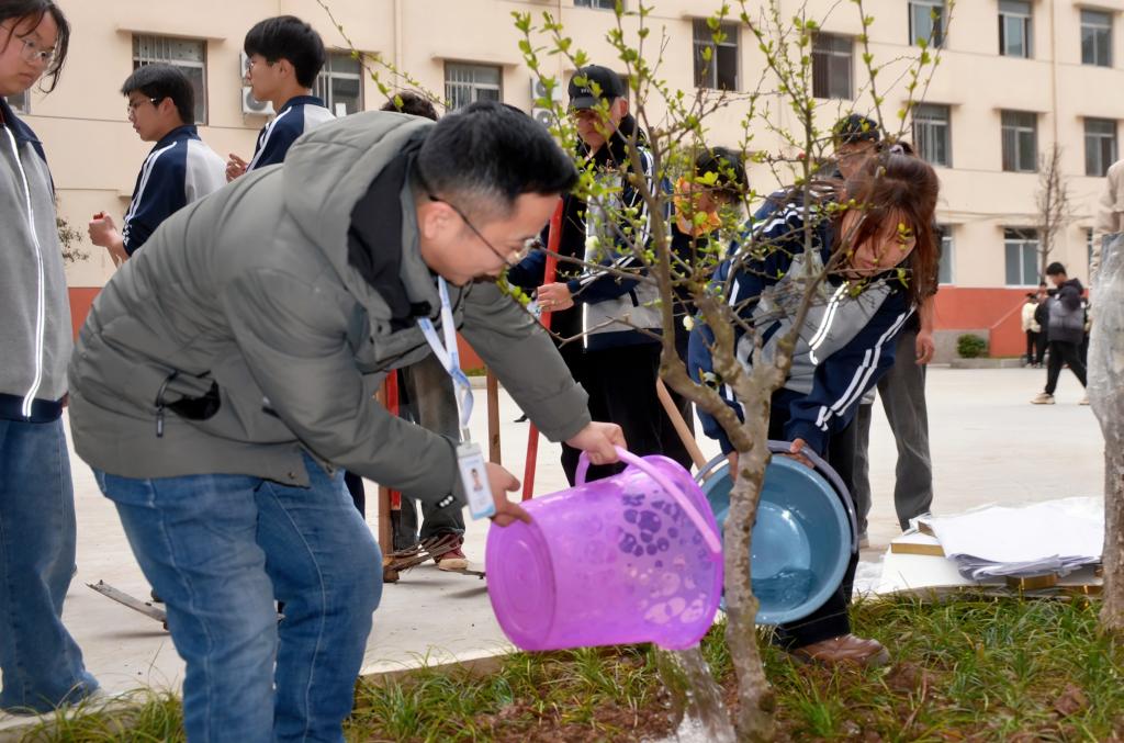 活动现场,大家分工明确、齐心协力,有的挥锹铲土,有的扶苗培土,有的提水浇灌。在师生们的共同努力下,桃树、海棠树、迎春花等在学院里亭亭玉立,为学院内增添了许多新的生机。这些扎根校园的生命图腾,见证晨读的书声琅琅,课间的欢声笑语,在年轮里镌刻青春成长的印记。