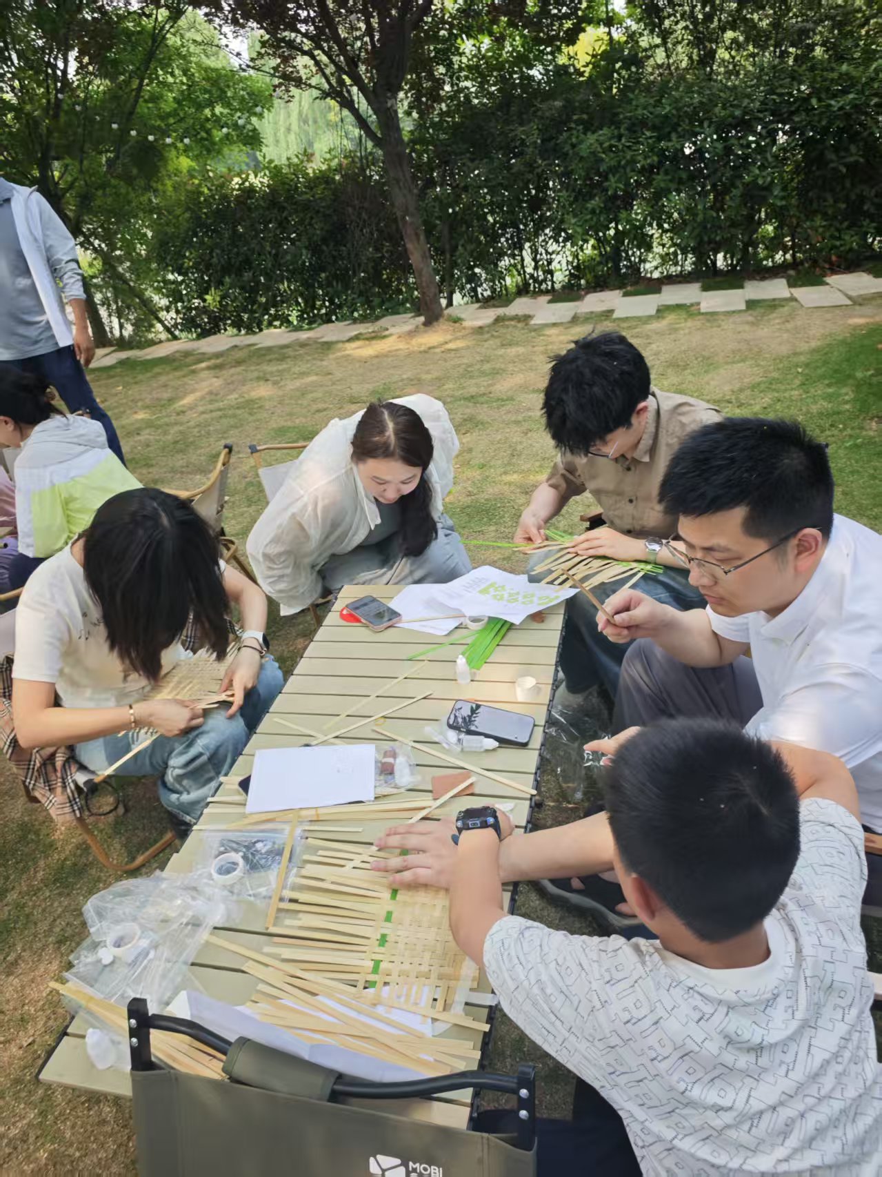 “体验制作非遗竹编扇子”活动则引领大家走入古老技艺的匠心世界。教职工们近距离触摸竹篾的柔韧肌理,在专业指导下,学习经纬交织的传统手法。一挑一压间,细密的竹丝逐渐化身为一柄柄精巧雅致的扇面。这不仅是一次指尖上的艺术实践,更是一次对非遗竹编深厚文化底蕴的沉浸式体悟。团队成员密切配合,互相指导,竹篾的韧性仿佛也联结起彼此交流的纽带,协作精神在指尖默契流淌。