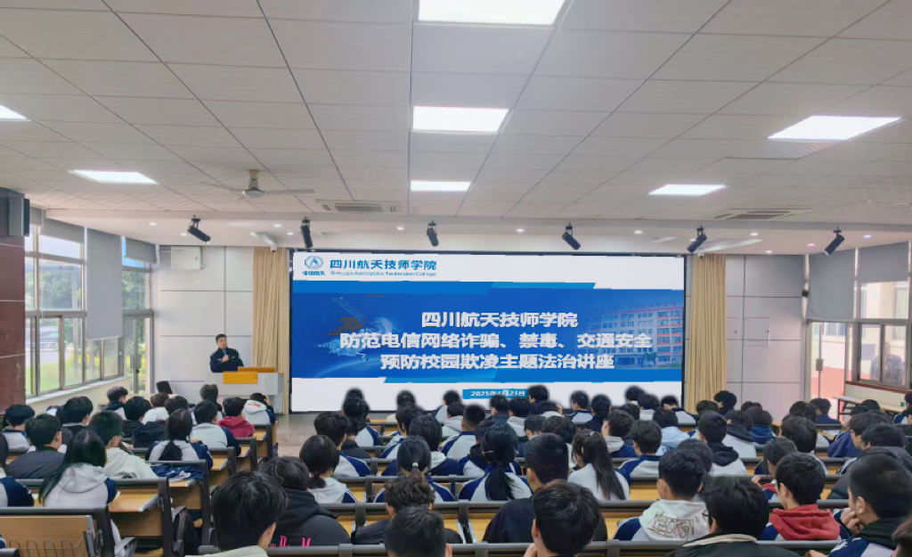 为深入贯彻落实法治校园建设要求,切实增强师生法治观念与自我保护能力,四川航天技师学院于10月30日邀请龙泉驿区北干道派出所民警范继平到校针对防范电信网络诈骗、禁毒、交通安全、预防校园欺凌等开展了主题鲜明、内容丰富的法治教育讲座,为全校师生送上“安全知识大餐”,筑牢校园安全防线。