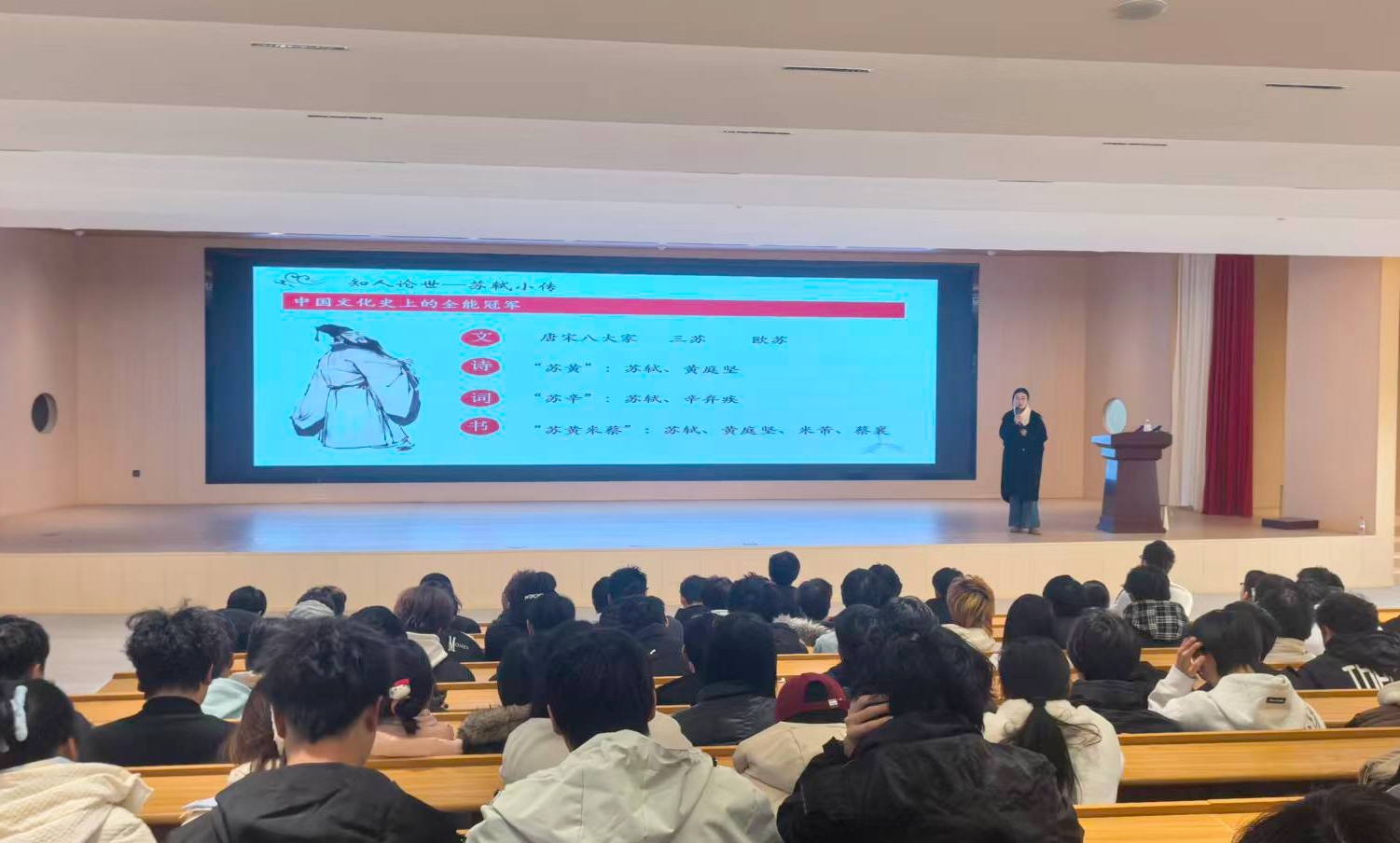 12月16日下午,通识教育学院“通识大讲堂”在知行楼A区学术报告厅举行。本次讲座以“从《前赤壁赋》读懂苏轼的人生觉醒与精神突围”为主题,由学院王瑶老师主讲,通过回顾苏轼跌宕起伏的一生,系统阐释了这位千古文豪如何在逆境中实现精神超越与智慧升华。