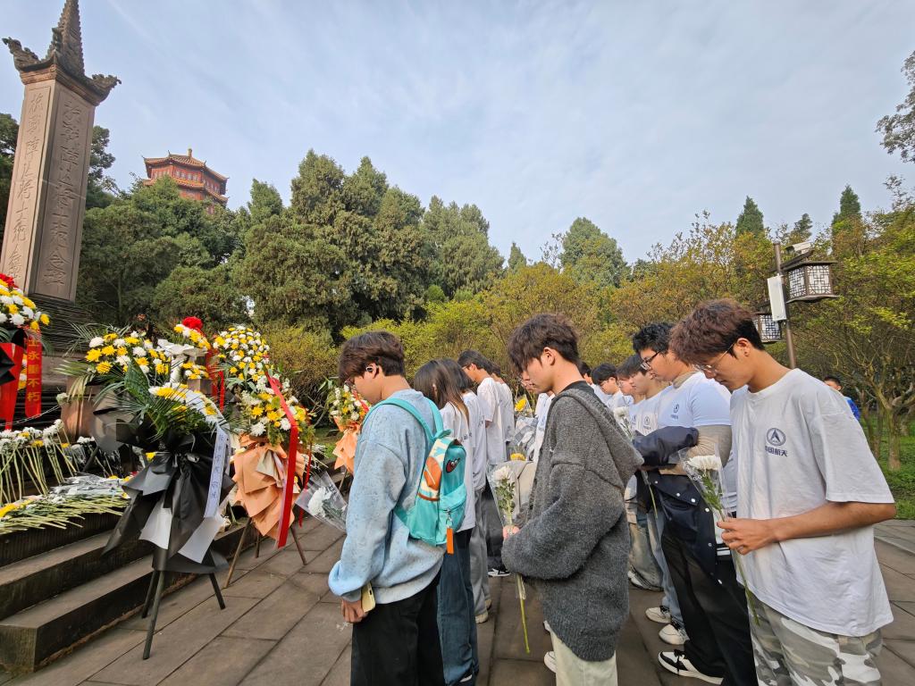 "万物生长此时,皆清洁而明净,故谓之清明。"清明节作为中华民族最重要的传统节日之一,承载着慎终追远、缅怀先烈的文化内涵。习近平总书记强调,"对一切为国家、为民族、为和平付出宝贵生命的人们,不管时代怎样变化,我们都要永远铭记他们的牺牲和奉献。"上午9时许,师生代表一行抵达广汉市雒城街道房湖公园。在苍松翠柏环绕的抗战阵亡将士纪念碑前,师生们庄严肃立,向在抗日战争中英勇牺牲的英烈们敬献鲜花,默哀致敬。一束束素雅的菊花,寄托着对先烈的无限追思;一次次深深的鞠躬,表达着对历史的崇高敬意。