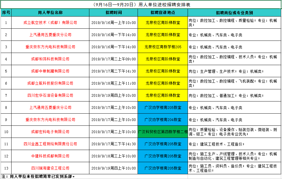 2019年9月16日起,就业处在给各系部开展就业启动会后,正式开始启动了2020届专场招聘会。专场招聘根据专业分布,分别在龙泉校区、广汉校区、科贸校区举行。在今年如此严峻的就业形势下,就业处致力于市场开拓,各系部积极配合,第一周专场招聘会召开情况良好,近200名学生收到了各大企业的橄榄枝。专场招聘还在紧锣密鼓的进行中,招聘情况将在就业处电子屏上滚动播放,敬请关注!