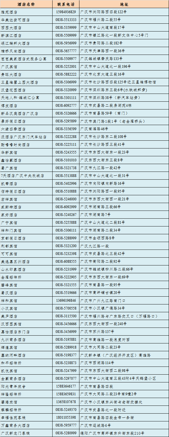 2019年8月新生报到期间广汉市部分酒店信息