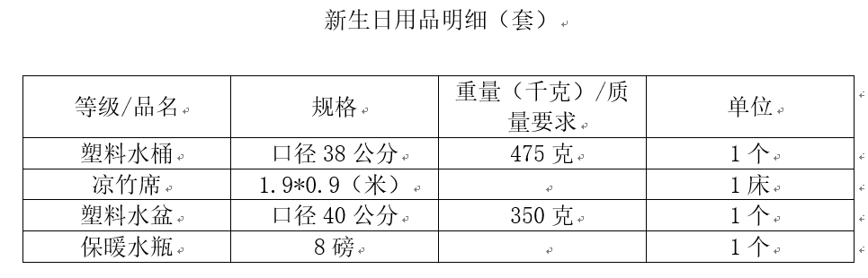 为做好今年新生入学的各项准备工作,学院决定采购4500套2017级新生日用品(品名、规格、质量要求见下表),有意参与我院2017级新生日用品的供应商请于2017年5月18日(含18日)前将样品和资质证书、报价单(资质证书、报价单合并密封一式两份,并在封面上注明联系人及联系电话)交学院(龙泉校区)党办。届时我院将通过现场议价,确定供应商。议价时间另行通知。