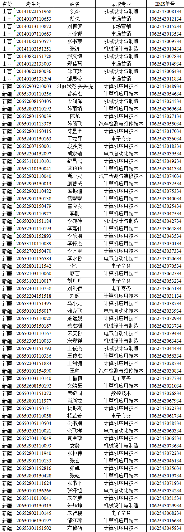 我院2020年在山西、新疆录取工作已经结束,录取名单如下(分省按姓名拼音排序)。通知书将于9月21日通过邮政EMS寄出,考生可凭EMS单号到邮局查询。录取新生请于10月10-11日到广汉校区(广汉市航天大道155号)报到入学。有任何疑问可拨打我院招生处电话:028-84809675、84809638、84809788。