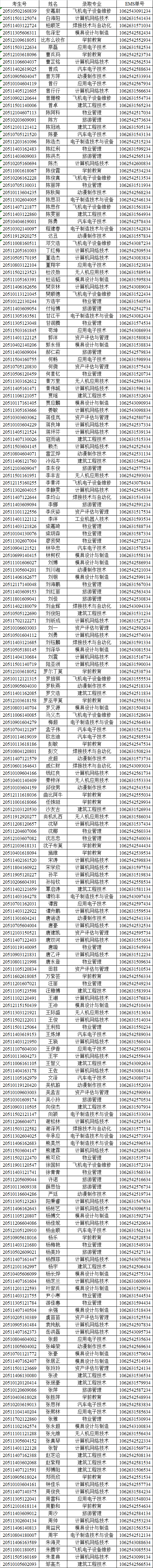 我院2020年在四川普通专科补录已经结束,录取名单如下(按姓名拼音排序)。通知书将于10月23日通过邮政EMS寄出,考生可凭EMS单号到邮局查询。录取新生请于11月3日到广汉校区(广汉市航天大道155号)致远楼204报到。有任何疑问可拨打我院招生处电话:028-84809675。