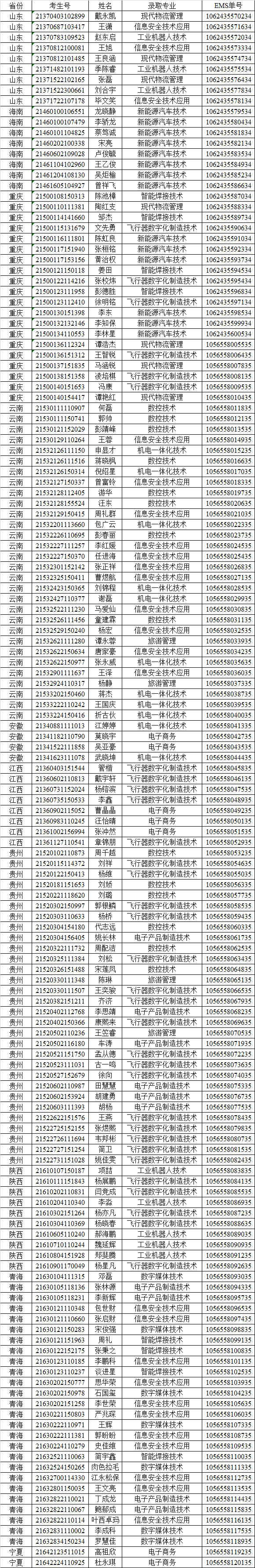 我院2021年在山东、海南、重庆、云南、安徽、江西、贵州、陕西、青海、宁夏录取工作已经结束。现将录取名单和EMS单号公布如下,通知书将于8月18日左右通过邮政EMS寄出。录取新生请于9月6日至7日到学院三星堆校区(广汉市航天大道155号)报到入学。有任何疑问请拨打学院招生处电话:028-84809675、84809638、84809788。