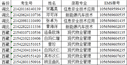 我院2021年在湖北和西藏的录取工作已经结束。现将录取名单和EMS单号公布如下,通知书将于8月24日左右通过邮政EMS寄出。录取新生请于9月6日至7日到学院三星堆校区(广汉市航天大道155号)报到入学。有任何疑问请拨打学院招生处电话:028-84809675、84809638、84809788。