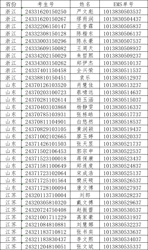 我校2024年在浙江、山东、江苏录取工作已经结束。现将录取名单和EMS单号公布如下,通知书于8月3日通过邮政EMS寄出。录取新生请于8月28日至29日到学校三星堆校区(四川省德阳市广汉市航天大道155号)报到入学。有任何疑问请拨打学校招生处电话:028-84809675、84809638、84809788。