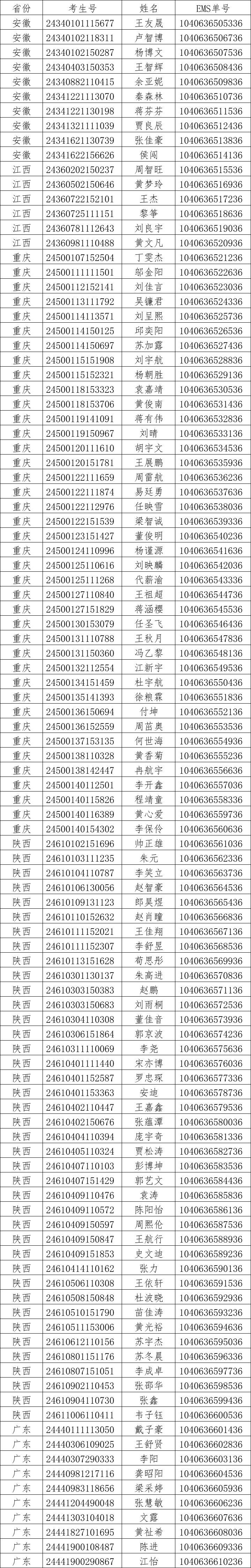 我校2024年在安徽、江西、重庆、陕西、广东录取工作已经结束。现将录取名单和EMS单号公布如下,通知书于8月10日通过邮政EMS寄出。录取新生请于8月28日至29日到学校三星堆校区(四川省德阳市广汉市航天大道155号)报到入学。有任何疑问请拨打学校招生处电话:028-84809675、84809638、84809788。