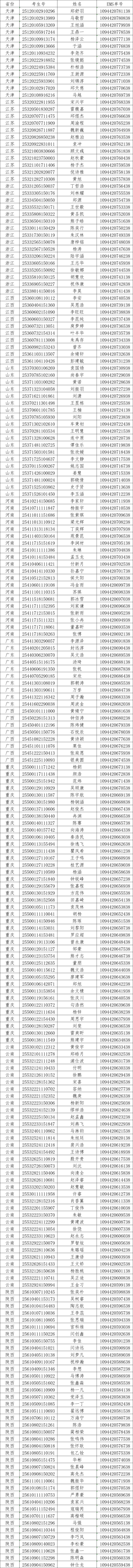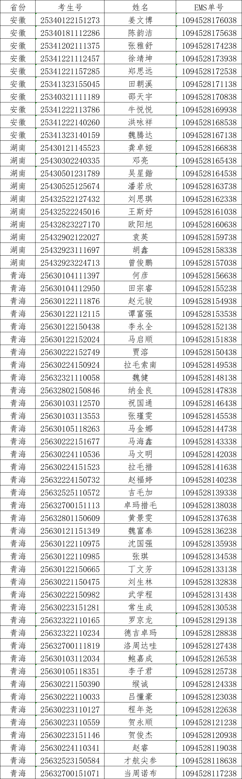 我校2025年在天津、江苏、浙江、江西、山东、河南、广东、广西、重庆、云南、陕西、安徽、湖南、青海的录取工作已经结束(其他省份录取还在进行中,录取结束后将更新此公告)。现将录取名单和EMS单号公布如下,通知书已通过邮政EMS寄出。录取新生请于9月4日至5日到学校三星堆校区(四川省德阳市广汉市航天大道155号)报到入学。有任何疑问请拨打学校招生处电话:028-84809675、84809788。