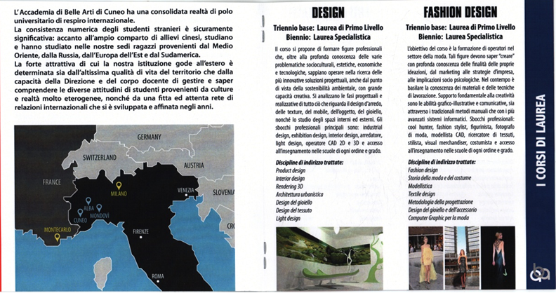 意大利库内奥美术学院在1992年起在法律上承认已经确立,提供为期三年的本科课程和为期两年的硕士课程。学院总部位于库内奥省的首府库内奥市。库内奥市是库内奥省的文化中心,也是库内奥省在经济角度来说,最重要的地区。库内奥市除了库内奥美术学院以外,还拥有库内奥科学院,两者并称为库内奥省的两大文化中心。 同时,库内奥伟大的文化和传统的工业,也是意大利北方最具代表性的。 库内奥美术学院建立完善的教学体系和收费标准,拥有完美的教学理论和极为严谨的教学方式,能让学生真正的掌握社会和市场所需要的技术和知识,使学生能够将创新的理念融入艺术和未来就职的职业之中。 库内奥秉承着这样的教学理念,使学生在职业技能和艺术研究这两个方向都能有极大的造诣,从而使库内奥美术学院的学生在各个方面都能全面发展。