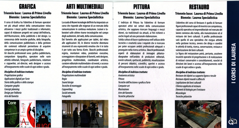 本课程课程旨在培训学生在视觉传达方面的能力,通过图形化的传统方式或电脑技术,将设计理念和艺术感传达出去。能够在各个领域发展。如出版行业,广告设计,摄影,传媒等等,竞争力非常的广泛。 职业机会: 广告传媒行业,印刷出版行业, 活动策划,广告摄影师, 编辑和撰稿人,艺术总监, 网页设计师和各级学校的教师 具体学科: 图像处理、艺术数字化处理、印刷工艺、计算机图形学、概念规划、卡通艺术、多媒体艺术:为期三年的本科课程/为期两年的硕士课程。本课程旨在让学生使用最新的技术和艺术理念去满足社会的需要。信息技术在不断发展。艺术也应该融合最新的技术资源。从漫画到平板电脑应用,从视频设计到3D应用,不同的技术都是艺术表现的工具,所有的现代技术都是艺术形式。 职业机会: 导演,视频编辑,执行制片人, 编剧和漫画书艺术家,网页设计师, 多媒体设计师,艺术协调师, 各级别学校的教师。具体学科: 多媒体设计、声音设计、安装技术、文案、社交网络、图像设计、绘画:为期三年的本科课程/为期两年的硕士课程 本课程旨在让学生拥有极佳的绘画能力,能够活跃在各种艺术领域中,不论是在现代新兴产业和传统艺术中,都能通过扎实的艺术造诣和创造力满足各个领域的要求。与此同时,也能够继续在艺术中探索。 职业机会: 图像处理专家,图像编辑制作 文化活动,表演, 广告,各级学校的教师。 具体学科:艺术解剖学、绘画、雕刻图形艺术、电脑艺术、插图、卡通艺术、绘画技巧、古文物修复:为期三年的本科课程/为期两年的硕士课程。该课程旨在培养学生修复,维护,保护,研究各类文化遗产的能力,使学生能有效的管理文化遗产,也使学生能够在艺术品的市场运作中有所建树。 职业机会; 古文物修复师,各级学校的教师 具体学科: 画作修复、壁画修复、文化遗产修复、应用类型恢复 生物学类型修复、博物馆学、绘画技巧。
