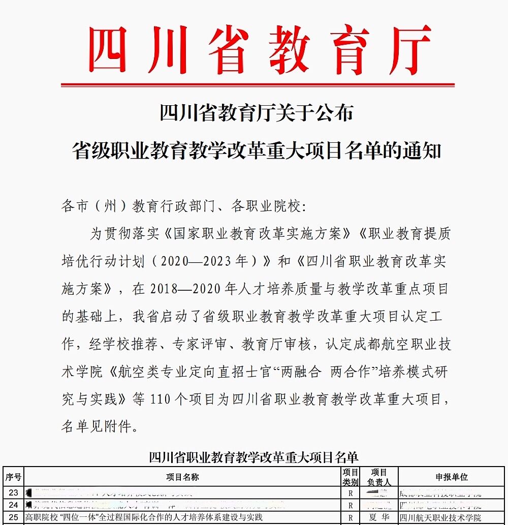据悉,四川省职业教育教学改革重大项目是我省为贯彻落实《国家职业教育改革实施方案》《职业教育提质培优行动计划(2020-2023年)》和《四川省职业教育改革实施方案》,落实立德树人根本任务、全面深化改革、强化内涵建设、促进教学研究、提升教学水平、推进职业教育内涵式发展、不断提高人才培养质量而设立,在2018-2020年人才培养质量与教学改革重点项目基础上,经学校推荐、专家评审、教育厅审核,最终形成认定名单。