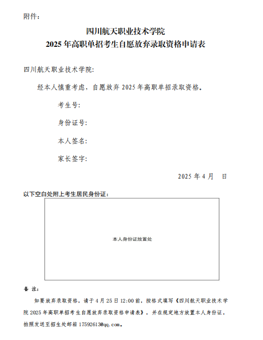 投档到我校的考生可以在2025年4月25日中午12:00前申请放弃录取资格。拟申请放弃录取资格的考生请考生本人手写放弃录取申请书,由家长和考生本人签字并将考生本人身份证放置在申请书上,拍照后以图片形式发送至学校招生处邮箱([email protected]),逾期不再接受放弃录取申请。
