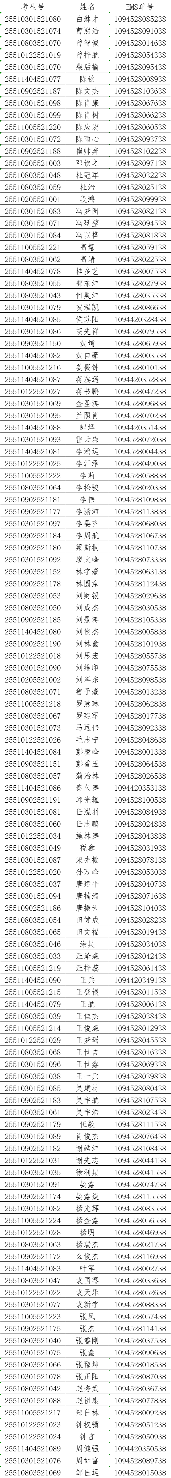 我校2025年五年一贯制大专录取工作已经结束。现将需要邮寄新生本人的录取通知书EMS单号公布如下(按姓氏拼音排序),通知书于8月13日通过邮政EMS寄出。录取新生请于9月4日至5日到学校三星堆校区(四川省德阳市广汉市航天大道155号)报到入学。有任何疑问请拨打学校招生处电话:028-84809675、84809788。
