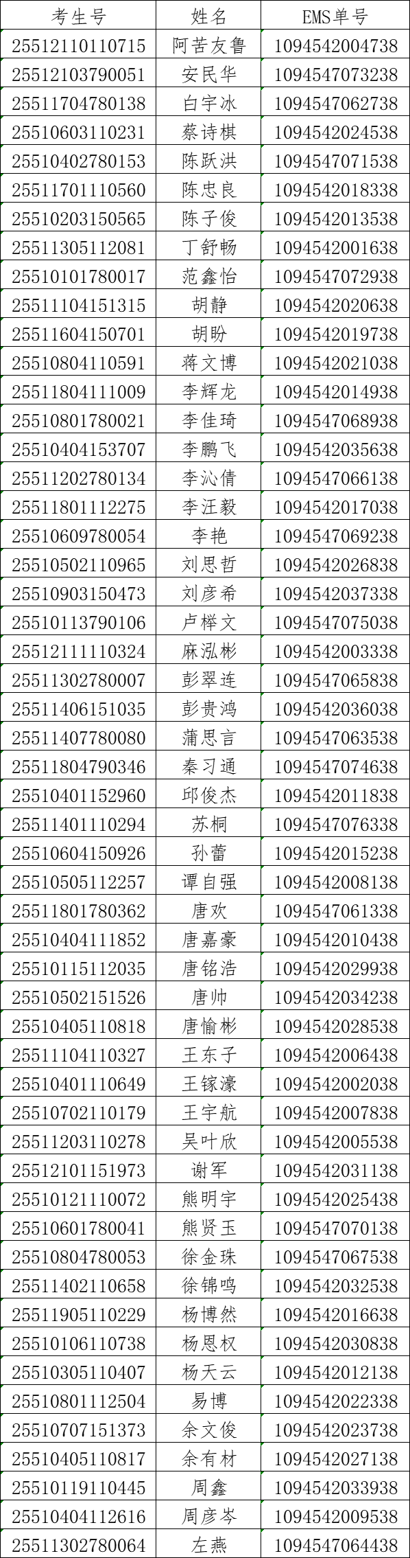 我校2025年在四川省补录批次录取工作已经结束。现将录取名单和EMS单号公布如下(按姓氏拼音排序),通知书已通过邮政EMS寄出。录取新生请于10月11日到学校三星堆校区(四川省德阳市广汉市航天大道155号)报到入学。有任何疑问请拨打学校招生处电话:028-84809675、84809788。