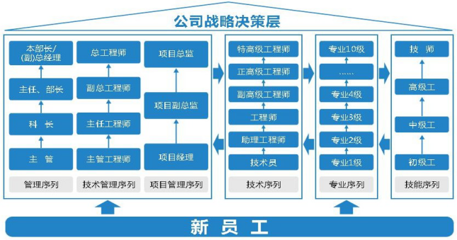 公司设计“管理、技术、专业、技能”四大职业发展通道及轮换路径,以可视化方法实现岗位职责、学习要求、能力及绩效要求、福利待遇等的显现化,打造内、外职业生涯相互提升的可视化职业生涯发展体系,为员工向上发展提供“牵引力”。