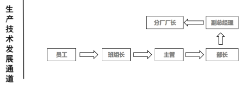 公司生产技术人员可从一线员工逐步向班组长、主管、部长、副总经理、分厂厂长发展,并可从生产部向工艺工程保障部、物资保障部、市场部等其他部门拓展职业路径。