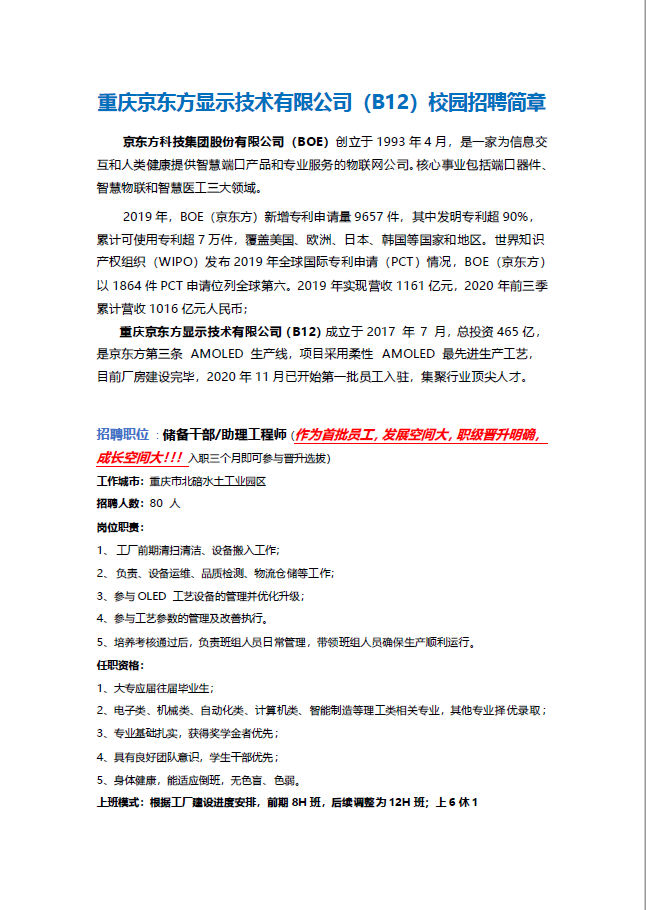 重庆京东方显示技术有限公司校园招聘简章