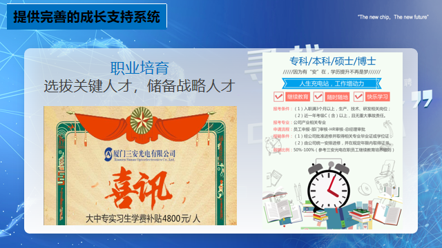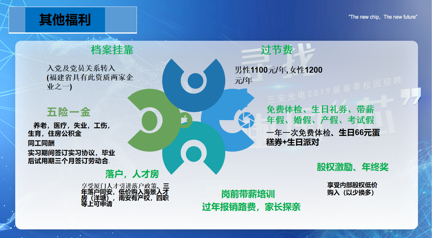二,入司福利:免费工作餐,免费提供全新宿舍及公寓(独立卫生间及淋浴(干湿分离)、热水器、空调、洗衣机、24小时开水、网络等),购买保险,带薪年假,久任奖金,三安学院多层次的培训体系,专升本,本升研在职学历提升教育学费补贴等优待!