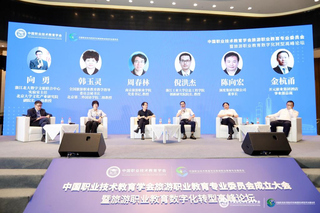 在“圆桌论坛”环节,全国旅游职业教育教学指导委员会秘书长、北京第二外国语学院韩玉灵教授,南京旅游职业学院党委书记周春林教授,浙江工业大学信息工程学院创新研究院院长倪洪杰教授,顶度集团有限公司董事长陈向宏以及开元酒店集团事业部总裁金杭甬同台,共同探讨教育数字化转型背景下,旅游职业教育的挑战、机遇和发展方向。