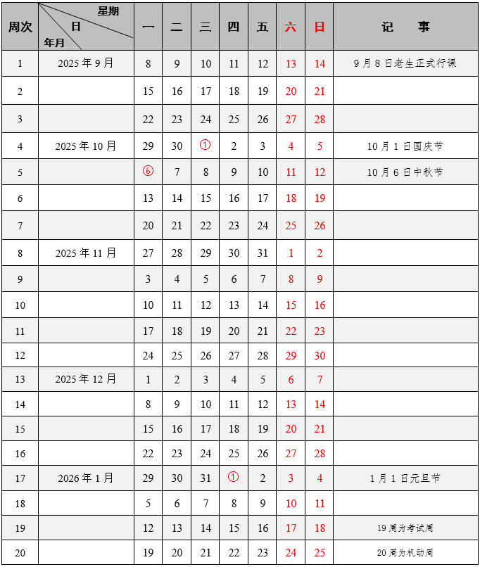 十大网投平台排名2025-2026学年第一学期校历