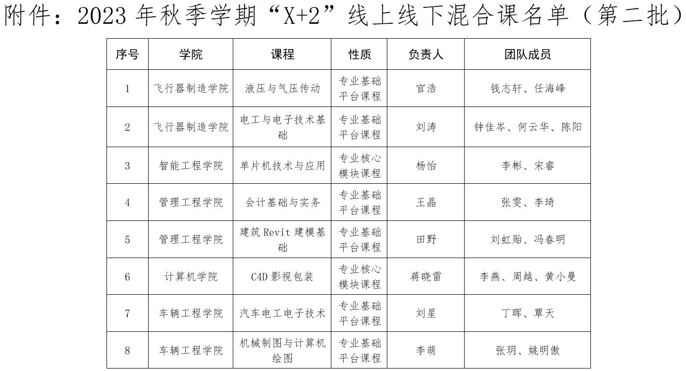 为深化教研教改,推广混合式教学、翻转课堂等新型教学模式,推动课堂革命,结合前期申报和首批评审情况,教务处组织评审组对申报书、课程标准和课程平台资源对照审核,按照“成熟一门,批准一门”的原则,确定8个课程团队实施2023秋季学期“X+2”线上线下混合课(第二批)教学试点,具体名单见附件。