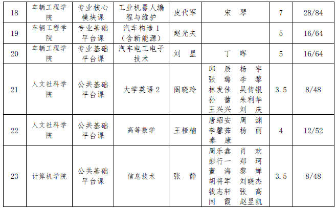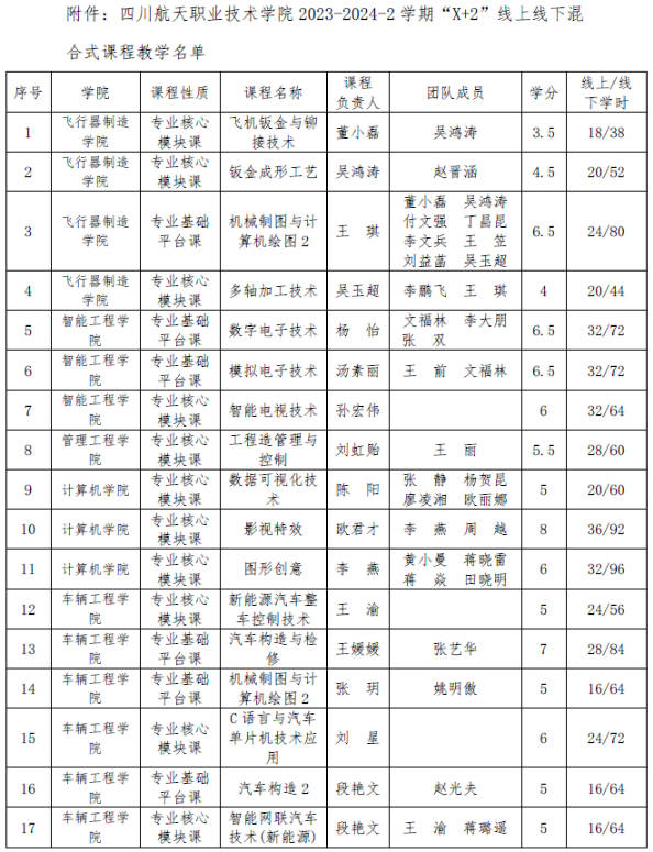 为进一步深化教育教学综合改革,加强信息技术与教学过程深度融合,推广混合式教学、翻转课堂等新型教学模式,培养学生自主学习和深度学习的能力,结合前期申报情况,教务处组织评审组对申报书、课程标准和课程平台资源对照审核,确定23个课程团队(20门专业课,3门公共课)于2023-2024-2学期实施“X+2”线上线下混合式课程教学,具体名单见附件。