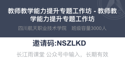 为方便全校教师及时获取学校开展的各种教学相关培训资料,进行培训内容的再学习与深化。现将相关资料放置于长江雨课堂班级中,请各位老师按照下图中的邀请码,加入进行学习。
